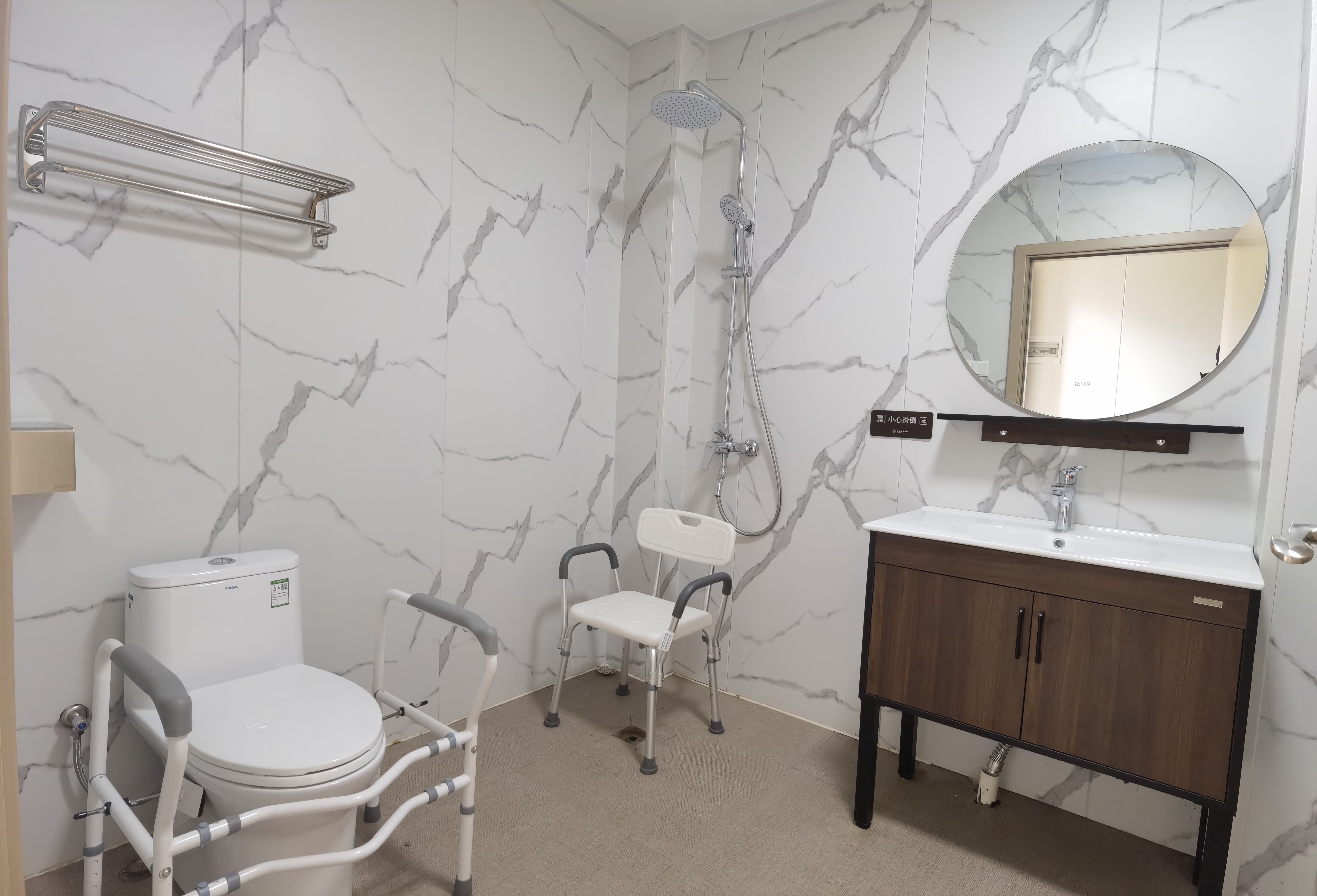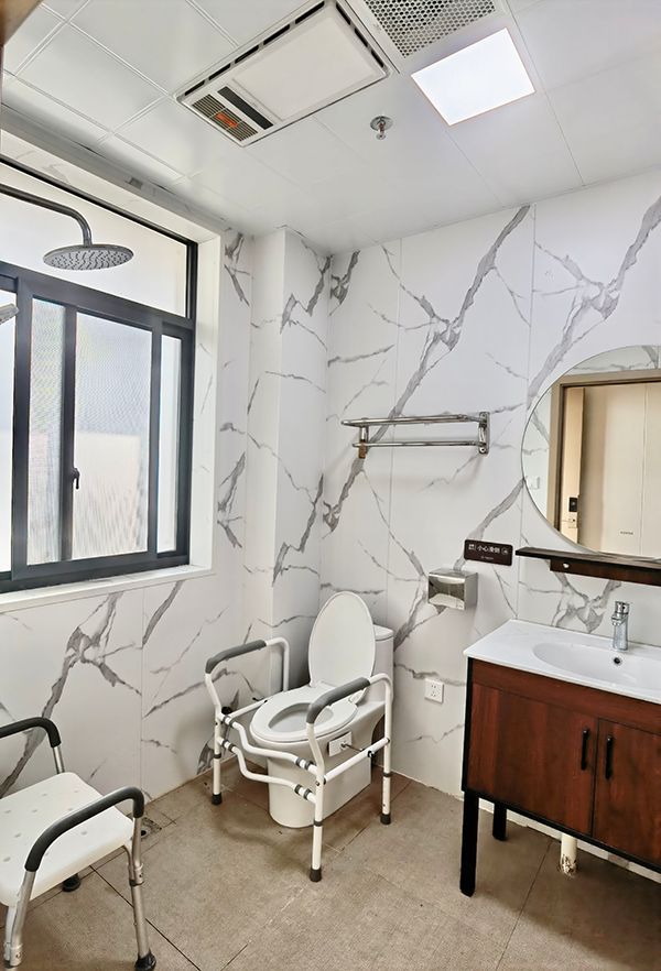 衛(wèi)生間的馬桶配有防護(hù)設(shè)施,能保證長(zhǎng)者的安全,房間其他配套設(shè)施齊全,就像自己的家一樣溫馨。