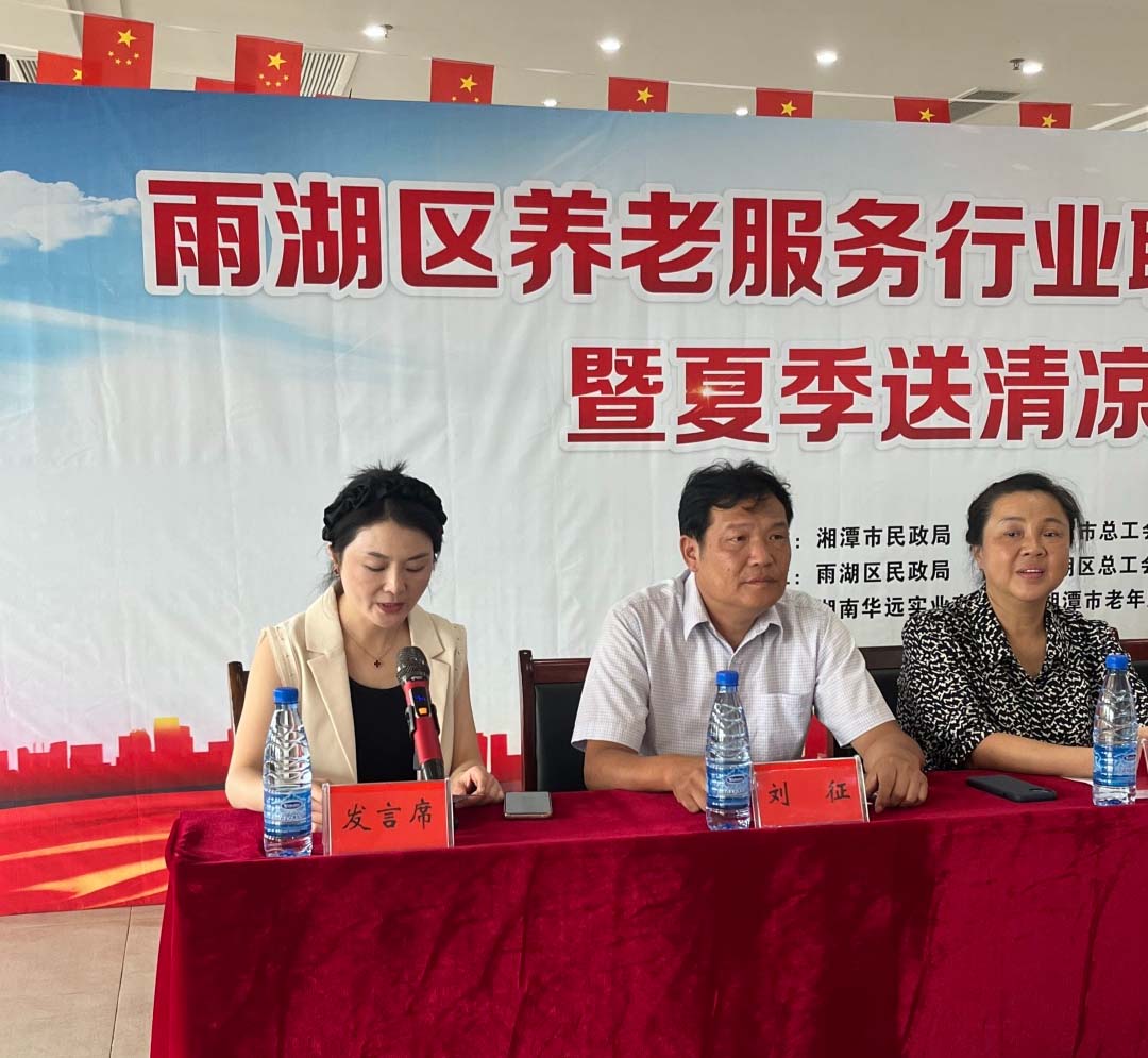 8月23日,雨湖區(qū)養(yǎng)老服務(wù)行業(yè)聯(lián)合工會授牌儀式暨夏季送清涼活動在我院舉行。區(qū)總工會黨組書記、常務(wù)副主席劉征,人大常委會副主任、區(qū)總工會主席譚聯(lián),市總工會黨組成員、副主席羅軍,湘潭市民政局黨委委員、副局長韓賢海,雨湖區(qū)委副書記蔣文武,市工會組織部部長劉志勇,以及來自雨湖區(qū)各養(yǎng)老機構(gòu)的負責(zé)人代表參會,雨湖區(qū)民政局黨組書記、局長干建暉主持會議,華遠康養(yǎng)中心法人譚燦任首屆工會主席。